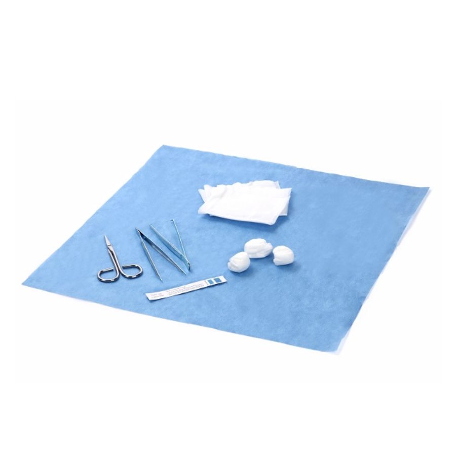 Spunlace-bolletjes, 35 g/m² spunlace, 3 st Wegwerpverbandtang, metaal, spitse punt, 12 cm, 1 st Weefselpincet, metaal, 12 cm, 1 st Spunlace-pads, 14,5 x 19,35 cm, gevouwen formaat 7,25 x 9,75 cm, 4-laags, 3 stuks Hechtverwijderingsschaar, metaal, 14 cm, 1 st Dienblad, 17 x 11 cm, 1 st Omslagdoek, 40 x 40 cm, 35 g/m² SMS-vliesstof, 1 st Sterilisatie-indicatorkaart, 1 st |